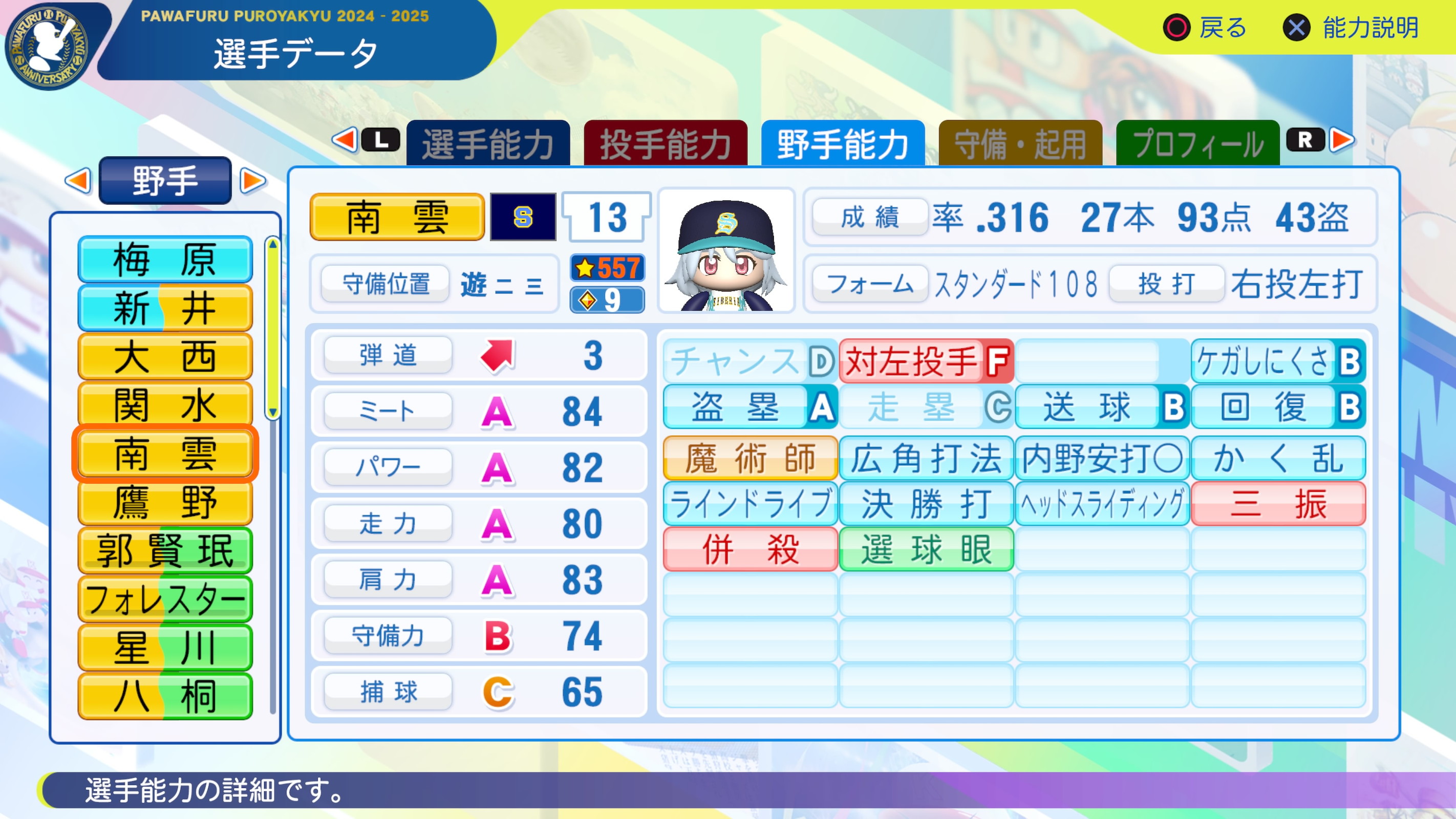 3番を打つ不動のショートストッパーです。パワー・ミートは共にAと基礎能力は高めですが、「対左投手F」や「ラインドライブ」があるので実際の成績は意外と控えめだったりします。