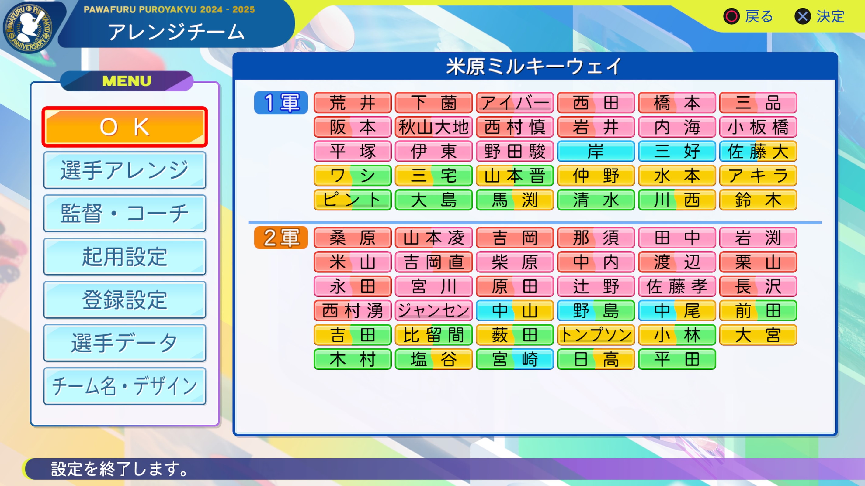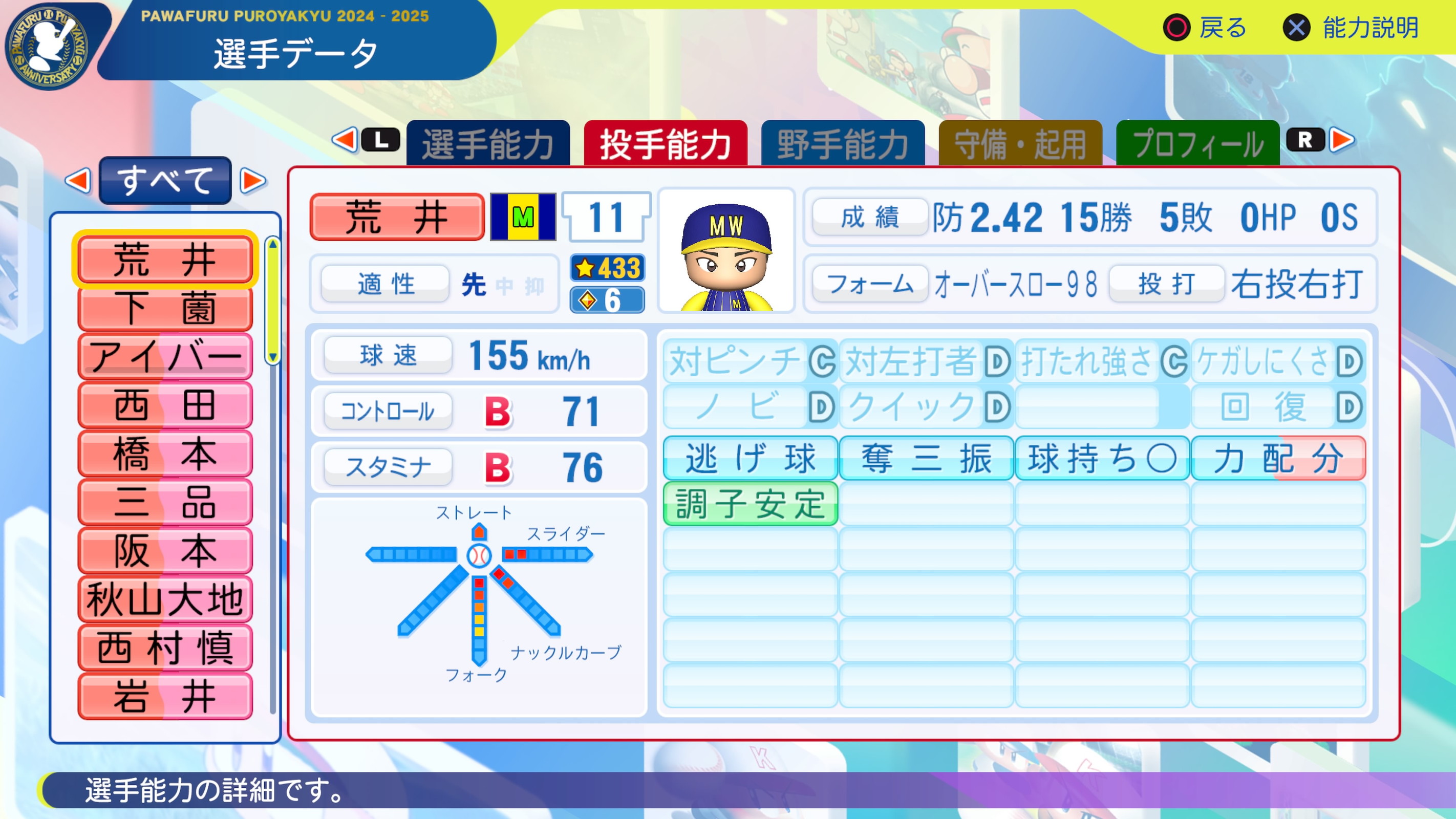 主力とその他の格差が激しいチームだと思います。なので、打線が揃っている時にエースと勝ちパが登板すれば理論上淡々と勝つことが想定される……けども故障者が出たらあるいは、というバランスになっているかもしれません。