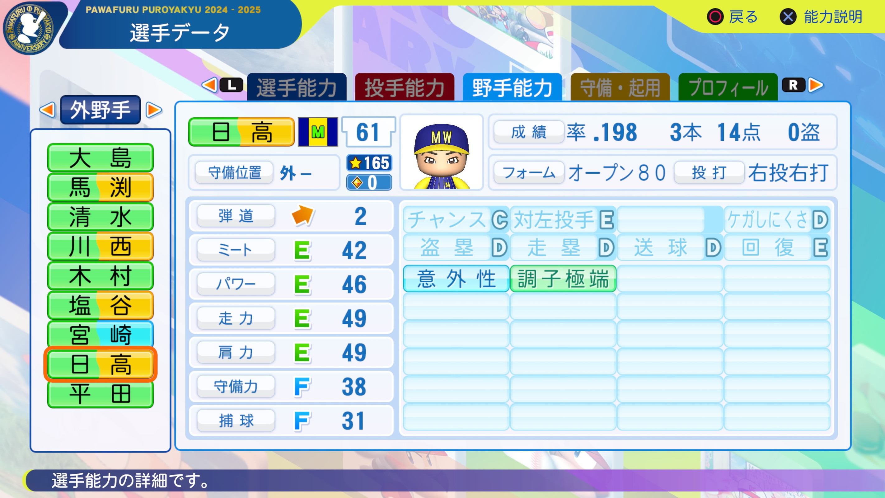 一方、下振れた底はこんな感じ。噛み合い次第ではこういう全ステータスが低い選手も誕生してしまうのですが、彼にはスポットで輝いて欲しいのでチャンスCと意外性と調子極端を持たせました。