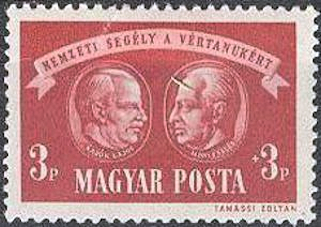 最初の切手/出身国最初の切手(1945年、ハンガリー発行)=右