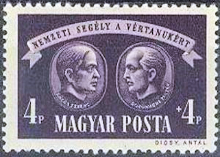 最初の切手/出身国最初の切手(1945年、ハンガリー発行)=左