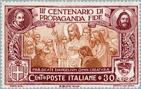 最初の切手(1923年、イタリア発行)=右上