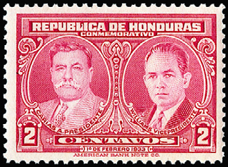 最初の切手/出身国最初の切手(1933年、ホンジュラス発行)=右