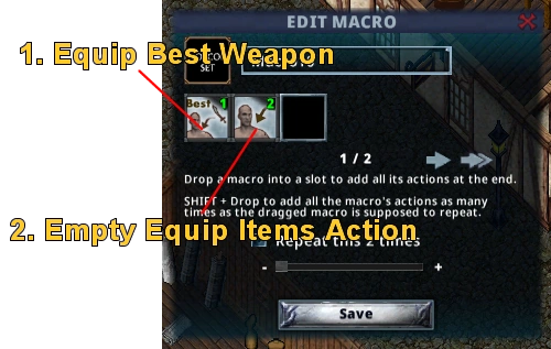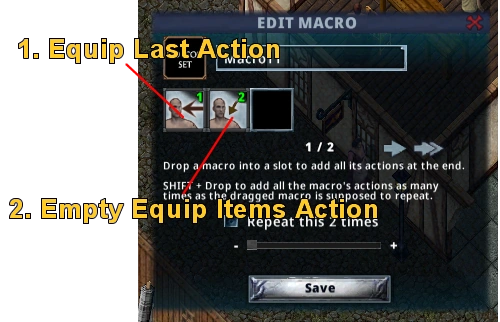 「最後に装備」アクションと同様に、これはマクロ内で使用し、その後に空のアイテムを装備する必要があります。このアクションをマクロ スロットにドロップした後、使用するデフォルトの武器/魔法書をターゲットにする必要があります。