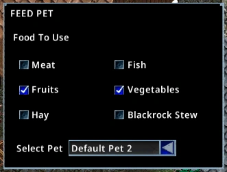このアクションを使用して、バックパックにある選択した種類の餌をデフォルト ペットに与えます。[アクション設定の編集] を使用して、餌の種類と使用する デフォルト ペット(1 ~ 5) を選択します。