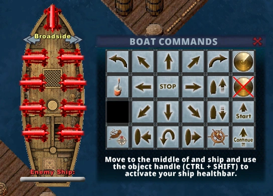 ボート コントロール ウィンドウには、船を移動したり大砲を発射したりするためのすべてのツールが用意されているほか、自船と敵船のヘルスバーも表示されます。ボート コントロールを有効にするには (または、ボート コントロールを閉じたときに再度有効にするには)、[ユーザー設定] -> [オプション]に移動し、[ボート コントロールの自動表示] を有効にするだけです。デフォルトでは、ボートに乗るとボート コントロールが表示されます (自分のものかどうかは判断できません)。