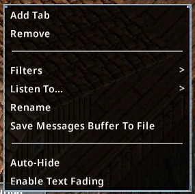 次に、メッセージを送信できるすべてのチャネルのリストが表示されます (これらのチャネルのテキストをクリックすると、クリックしたチャネルでメッセージを送信できるようにチャット ラインが設定されます)。また、メッセージを削除するためのチェックボックスもあります。チャット ラインの TAB サイクルからのチャネル (詳細については、チャット ラインのセクションを参照してください)。
