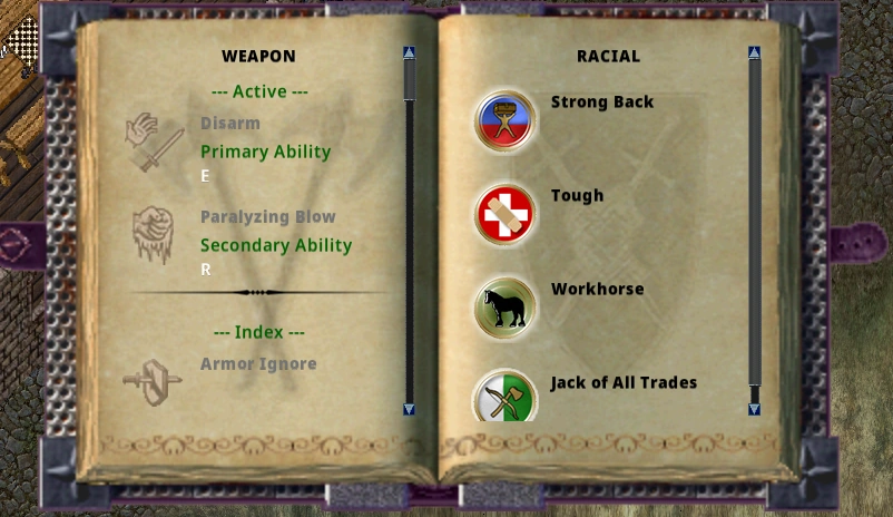 特殊能力ウィンドウには、武器の特殊攻撃と種族能力の両方がリストされます。