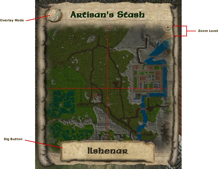 • マップ名/掘削ボタン:このボタンを押すと、シャベルが使用され、自動的にマップがターゲットになります。「自分の場所で掘る」オプションが有効になっている場合、このボタンは、掘削プロセスの開始時にあなたが立っている地面をすぐにターゲットにします。