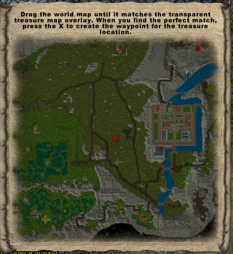 オーバーレイ モードは、宝の場所を簡単に見つけるのに役立つミニ ゲームです。このツールは、宝の地図とアトラスを重ねて配置することで機能します。タスクは、宝の地図と一致するまで半透明のアトラス マップを移動し、宝の場所 (X) をクリックしてウェイポイントを作成することです。以下の例のように: