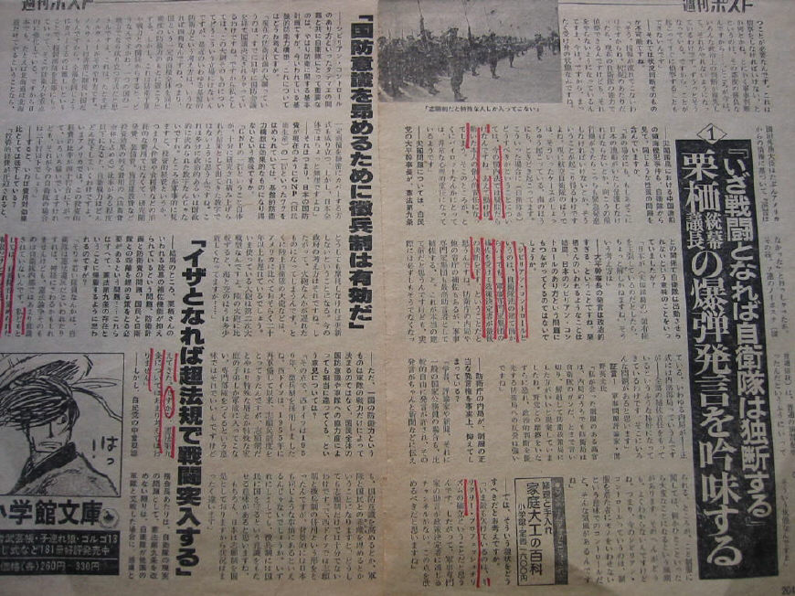 その田母神氏は、今年の4月18日、名古屋高裁イラク派遣違憲判決に対して「そんなの関係ねえ」と発言した。空自トップの言葉かと耳を疑った。本当にこの人は危ないと思った。東京大学での「講演」(5月24日)の際にも、挑発的・挑戦的な勢いを感じた。田母神氏の言動をみていると、30年前の栗栖弘臣統幕議長(第10代)の事件を思い出す。『週刊ポスト』1978年7月20日・8月4日合併号を書庫から出して、久しぶりに読んでみた。見出しには、「いざ戦闘となれば自衛隊は独断する」「徴兵制は有効だ」「イザとなれば超法規で戦闘突入する」と物騒な発言で物議をかもした。緊急事態法制の不備のため、政府が何もできなければ、現場は戦闘加入せざるを得ないという、軍事的合理性に沿った発言をしたわけだが、それを制服組トップが週刊誌に語ったということで、大事になった。