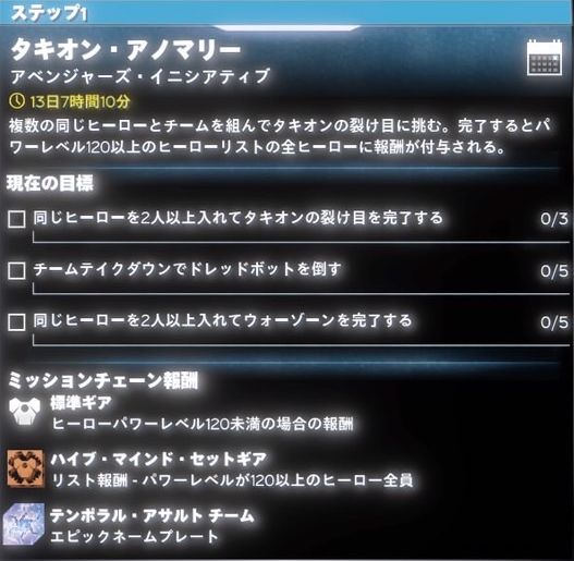「タキオン・アノマリー」の期間中、「タキオンの裂け目」ミッションが複数発生します。パワーレベル1~100のヒーローに特化したタキオンの裂け目ミッションも新たに登場し、同ミッションは毎日更新されると共に、そのミッションに相応しい報酬が付与されます。最後に、「帰郷」がタキオンの裂け目ミッションとして新しく追加されました。Marvel’s Avengersを新しくプレイされた方へ:「タキオンの裂け目」は一定期間中に発生するミッションで、通常はパワーレベル140以上のヒーローでないと開始できません。同ミッションは1週間に1ミッションのみ表示されますが、完了すると攻撃時にヒーローの意志力(体力)が回復される「コズミックギア」という強力なアイテムを獲得できます。タキオンの裂け目ミッションをアンロックするには、まず太平洋北西部の「SHIELDサブステーション・ゼロ」ミッションチェーンを完了しなければなりません。