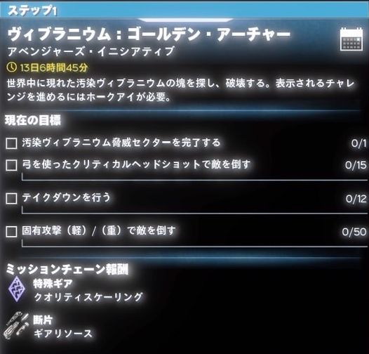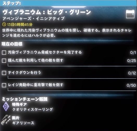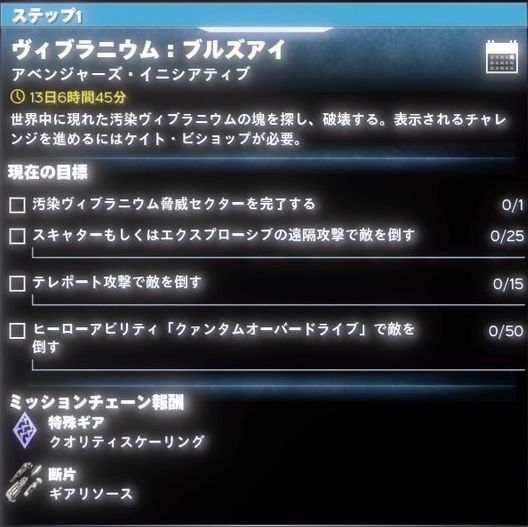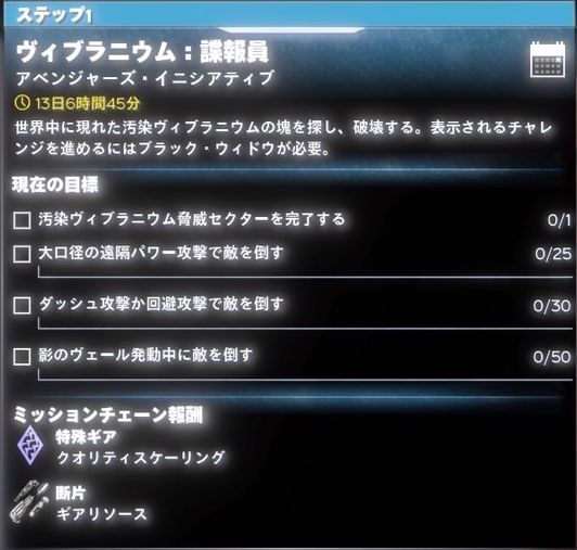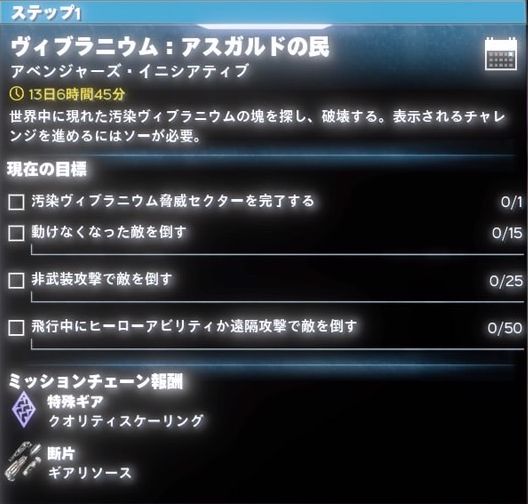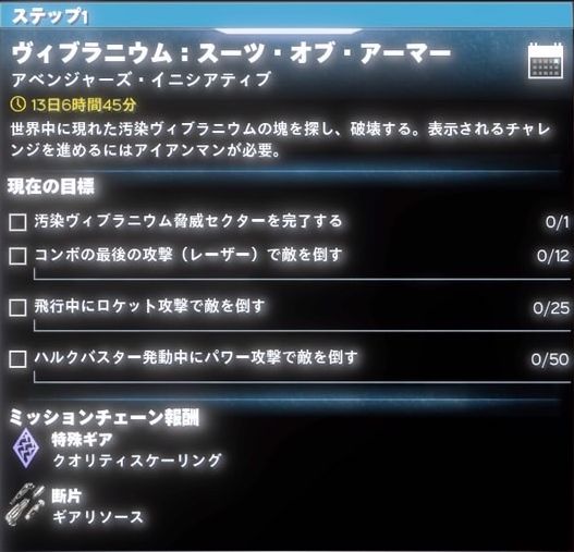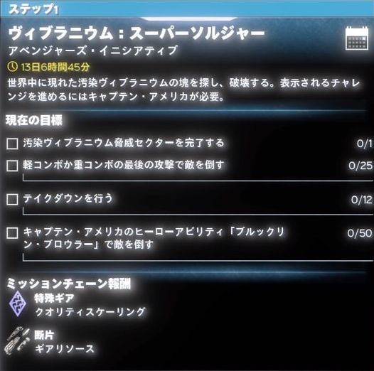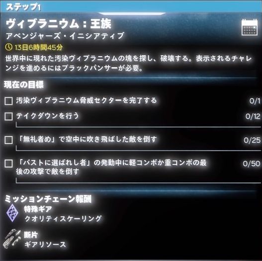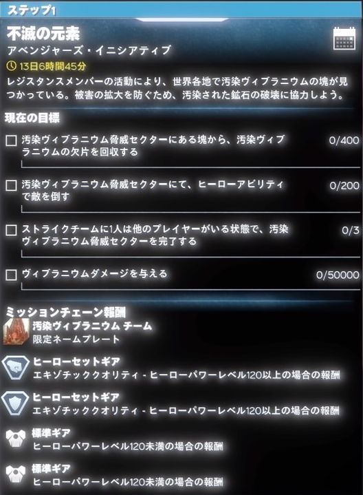 「汚染ヴィブラニウム脅威セクター」にはブラックパンサーを含む各ヒーローに独自のミッションが用意されており、そのミッションチェーンをクリアすると、ヴィブラニウムのステータス効果を与えるギアを獲得できます。またミッションチェーンを完了後、ヴィブラニウムのステータス効果を与えるギアを獲得できます。ギアを装備した状態で敵にダメージを与えると物理エネルギーの爆発が起こり、他の敵にもダメージを与えることが出来ます。