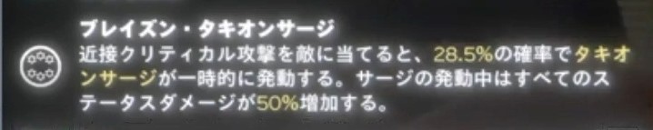 パーク3 | 近接攻撃クリティカル攻撃を敵に当てると、 確率でタキオンサージが発動 |
