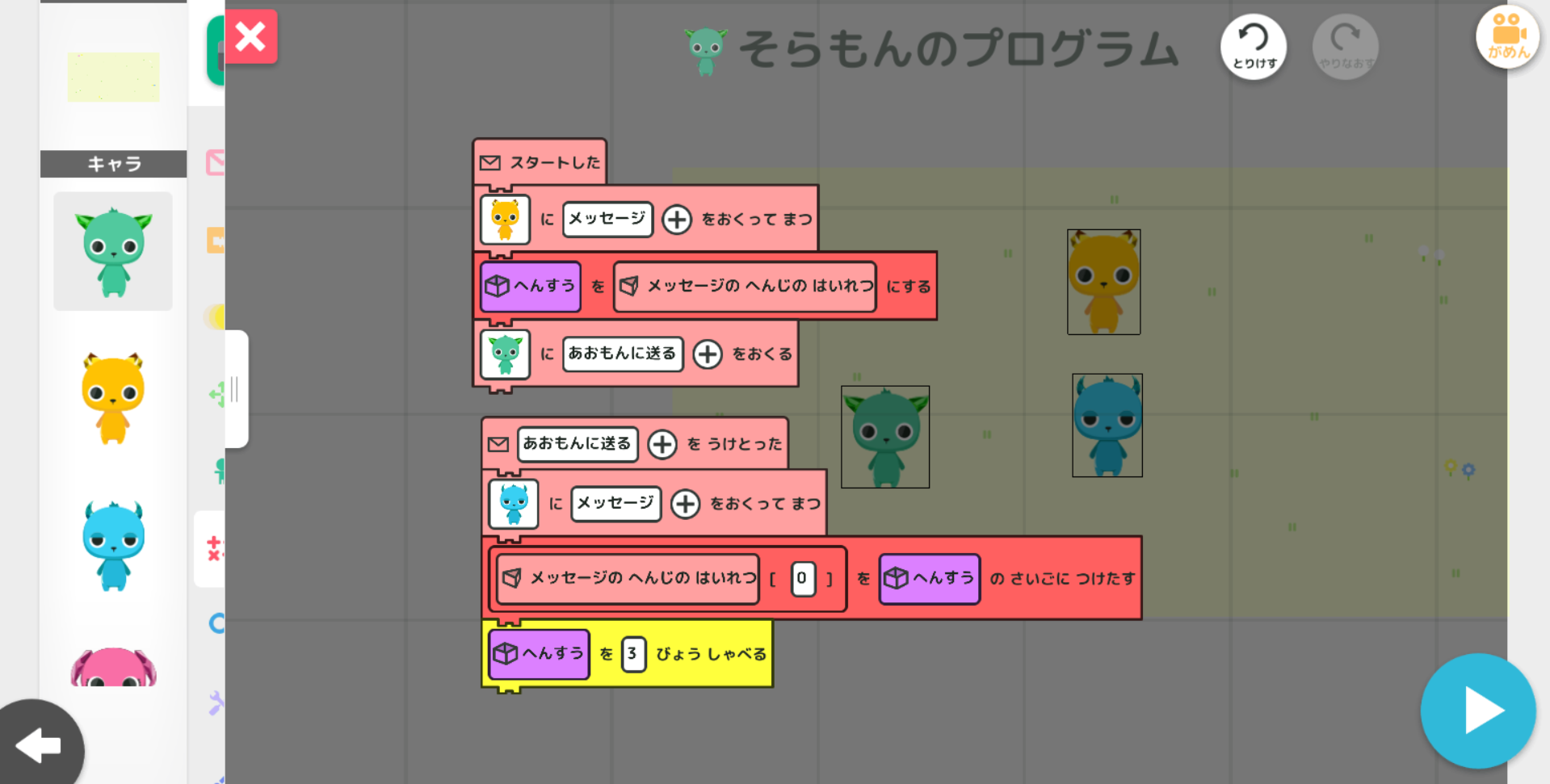- 配列の順番が完全にランダムになるので、「 へんすう[0] 」などのブロックが使えない