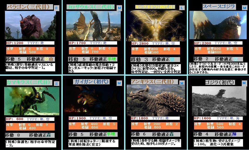 主役怪獣ともいえるゴジラ。能力は至って平均的で、格闘・射撃どちらで攻撃してもOK。HPが多少低めに見えるが、毎回敵の通常攻撃を100軽減できるので気にならない。ちなみに、進化カード『三式機龍』の由来は、機龍が初代ゴジラの骨によって生まれたサイボーグだからである。