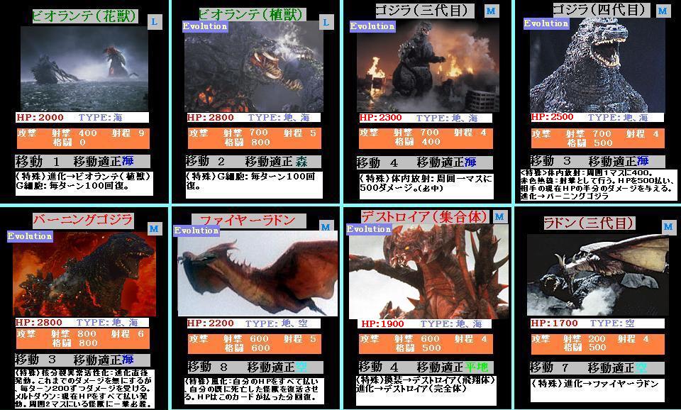 貧弱なゴジラザウルスから一転、強力な能力を得た。射撃の高さも目に付くが、特殊『体内放射』による複数の敵に対する安定したダメージも魅力的。別の進化であるゴジラ(四代目)と比べると若干能力値に劣りを感じるものの、必中の効果は大きく、どちらに進化させるか迷うところ。