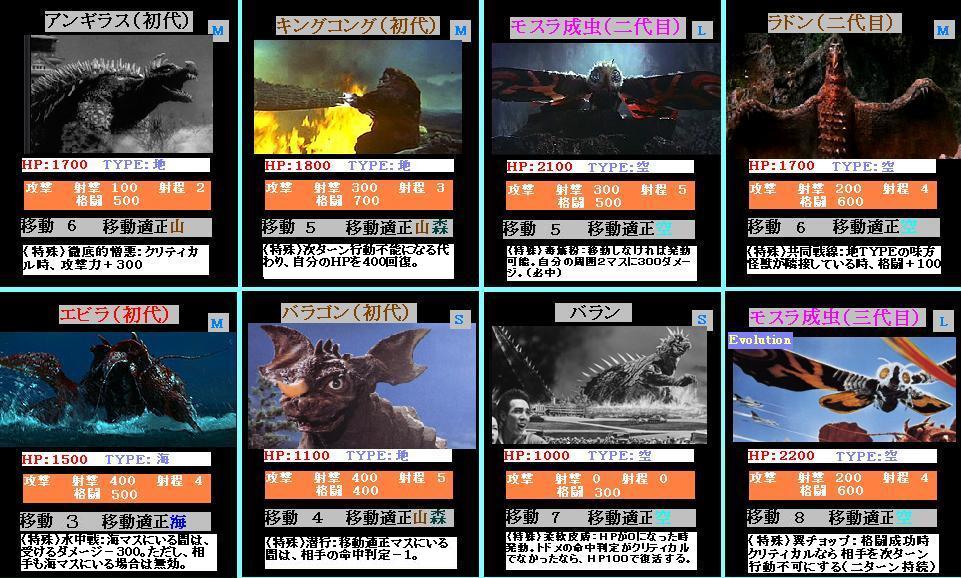 ジラと似たような能力だが、移動適正空を持つ分移動範囲が広い。特殊の『共同戦線』は、TYPE地の怪獣が隣接している時に攻撃力が+100されるもので、移動の高い怪獣と相性がいい。ただし、一体の相手を攻撃する場合位置の関係上どちらかの格闘しか当てられないので注意。