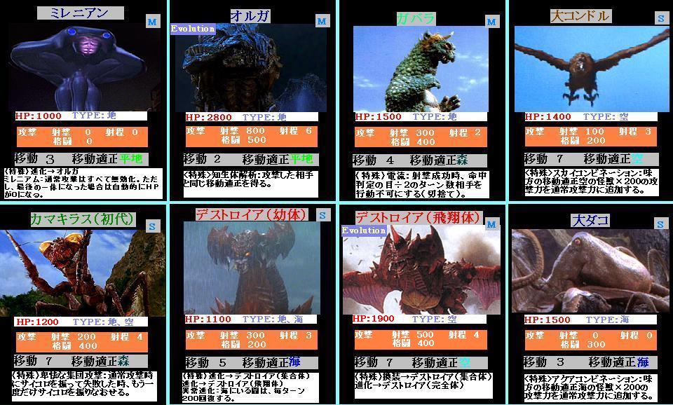 大コンドルが『空』での強化だったのに対し、こちらは『海』適正の仲間で強化。HPはS怪獣の中では最高、攻撃力も強化前から並程度あるので、強化しなくとも十分使える。が、移動が3で射撃も使えないため相手に近づく前に射撃で倒されないよう注意。また、コンドル同様ルールで強さが変動する。
