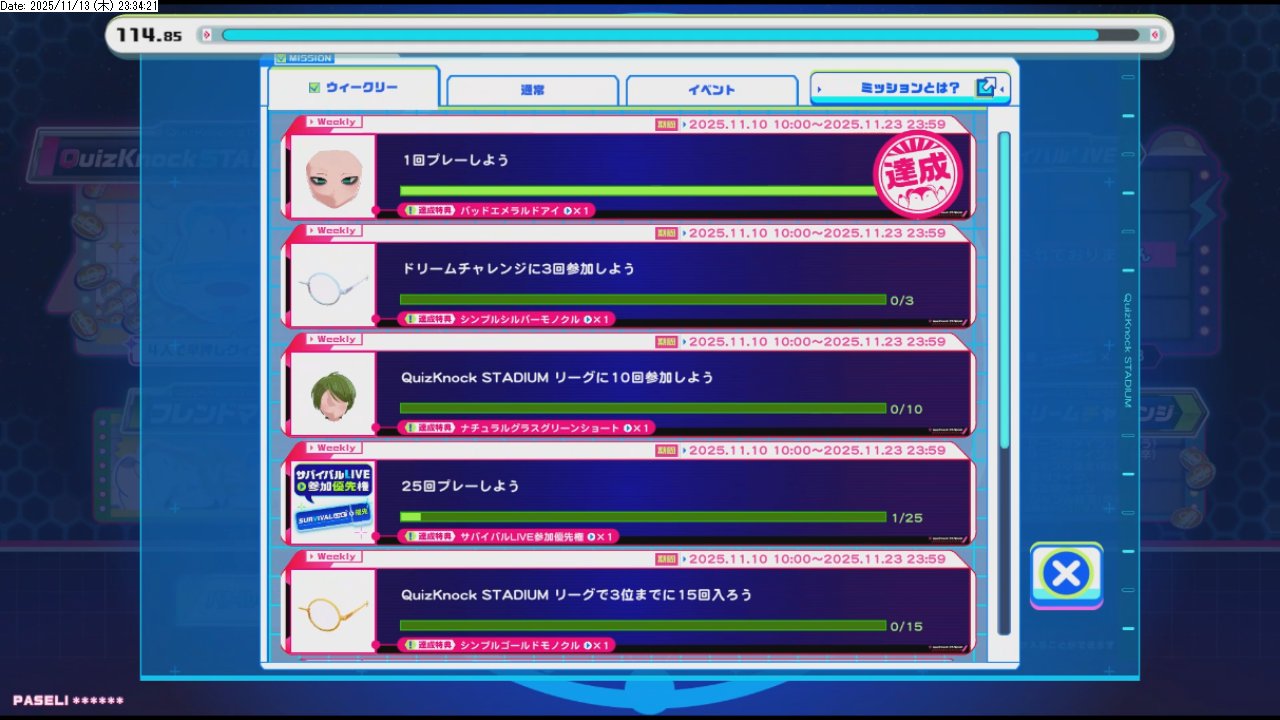 ・ ・サバイバルLIVE(定員99人+MC) 次回予定→30回:2024/??/?? MC 未定 ・├ランキング99内→当日受付19:45-20:00まで、チケット免除&10分優先 ・└その他 →当日受付19:55-20:00まで、チケット必須&先着順 ・ドリームチャレンジ(基本毎日開催 受付0分~5分間まで有効 人数制限なし) ・├12:30-35リーグ問メイン(ふつう) ・├17:00-05リーグ問メイン(ピリ辛) ・├18:00-05激辛ドリチャレ(※土曜限定、高難度の為チケット必須)} ・│・※2024/06/08(土)から変更(旧22:00(土)) ・├19:00-05ジャンル限定A(※日替わり) ・├20:00-05新問 メイン ・├21:00-05復習問 メイン ・└22:00-05ジャンル限定B(※日替わり) ・・・・・・ ※チケットについては、ウィークリーミッションの ・25回プレー/50回プレーで各1枚獲得できます。 |