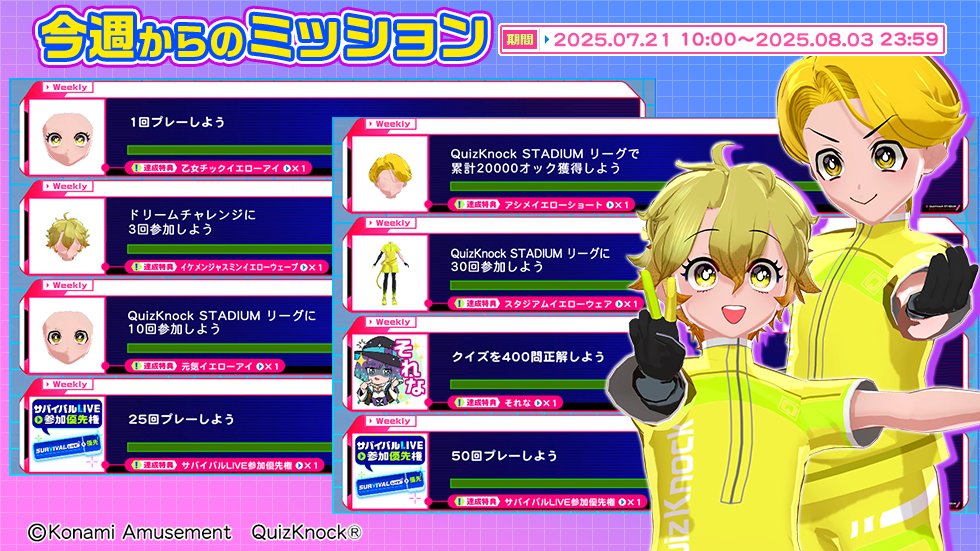 | 2025年7月22日(火)12:00 | (X画像)\ウィークリーミッションのお知らせ!/ 8月3日(日)までこちらのミッション開催中! 夏を彩る眩しいウェアや髪型を ゲットして押しに行きましょう!! 真夏も全力で楽しむッキュ~♪ #QuizKnockSTADIUM #ノクスタ |