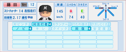通算成績 防御率3.89 19勝21敗8S77H 奪三振366
