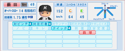 通算成績 防御率3.81 48勝72敗67S112H 奪三振744