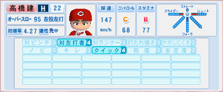 右打者への外角低めのシュートは素晴らしく、先発・中継ぎ・抑えと幅広い役割をこなして活躍し、広島ファンから「建さん」の愛称で親しまれた。