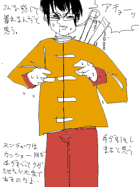 女性用のチャイナスーツは、スカートが横に切れているので、足を曲げて蟹股にすると、それはふんどしのように飛び出てしまうのだ。(普通こんな風にはしない!)着ている方を見ていると歩くときに足と接触する。それがヒラヒラと動くので綺麗でエロチックだった。特に肩から腰の当たりにかけて、服が肌にピタリと密着するせいなのか、体のラインがうっすらと作られる。これが恥ずかしいと言われる女性の方が多いようだ。外ではチャイナスーツを着て歩いている方はどうも少なかったけれども、それは寒かったからだったと僕は思った。その日僕は上着を四枚、股引を一枚着込んでいた。