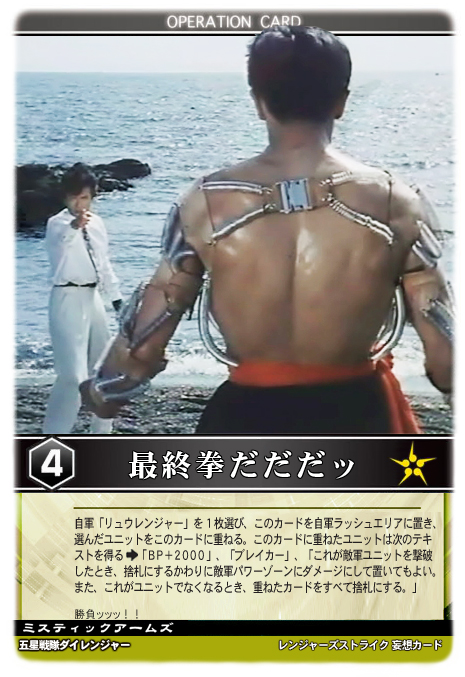 リュウレンジャー」を1枚選び、このカードを自軍ラッシュエリアに置き、選んだユニットをこのカードに重ねる。