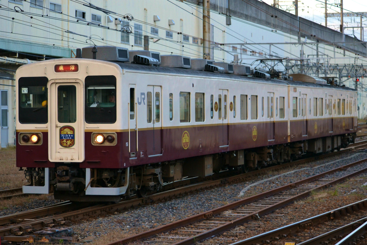 この107系日光線編成は投入当時、アイボリー地に「日光杉並木」をイメージした緑のN字(日光線の頭文字)をあしらい、ワンポイントに「神橋」をイメージした赤を前位部幕板部に配していた。