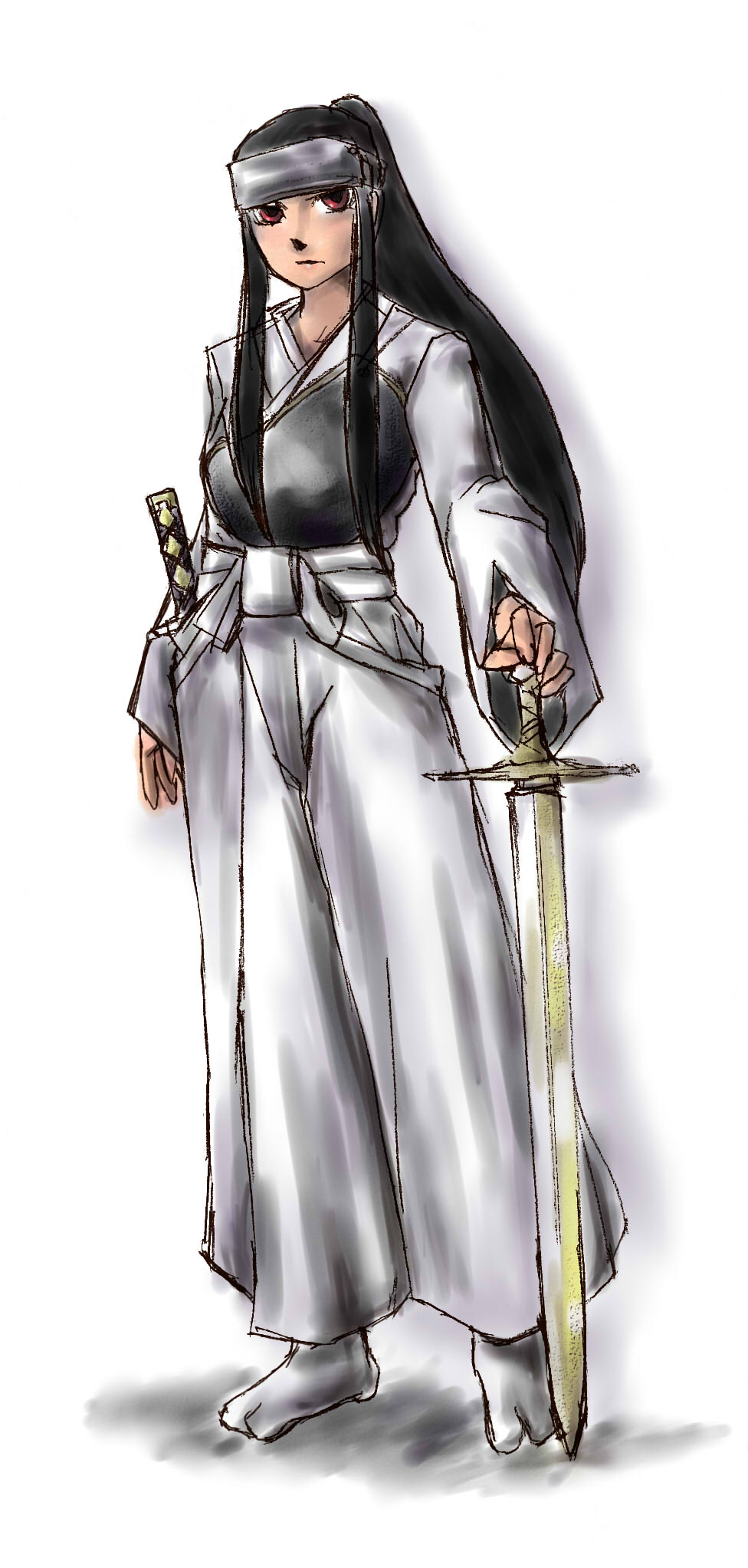 黒髪ポニーテールに鉢金、凛々しい瞳、道着に胸当てに袴に足袋という