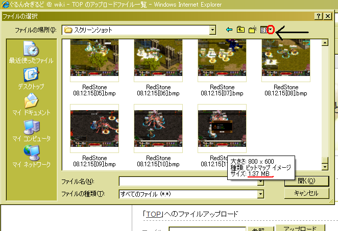 - ファイルの選択にあたり、赤色の下線で示す通り画像サイズが1MBを超えるのでスクリーンショットをそのままアップすることはできません。ペイントなどで不要な箇所を切り取っておきましょう。また赤丸で囲った▼で縮小版表示にすると見やすいです。