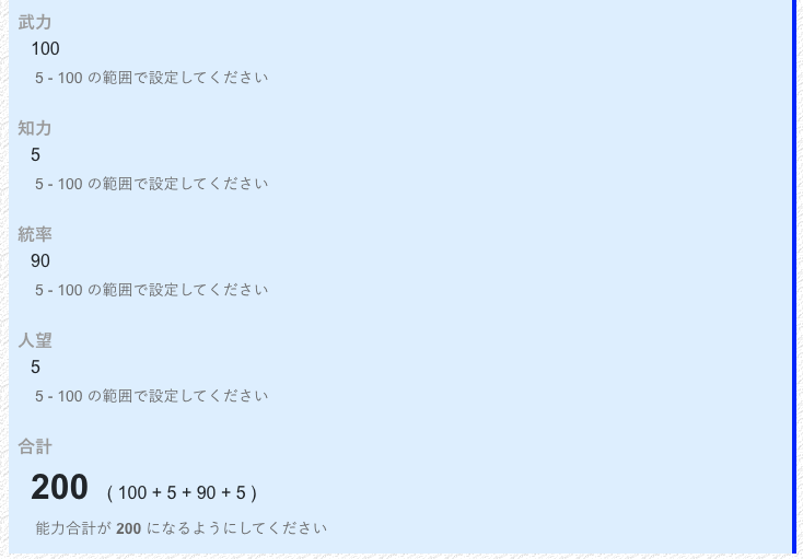 みねこ 武力、知力、統率、人望については#2で説明したわね |