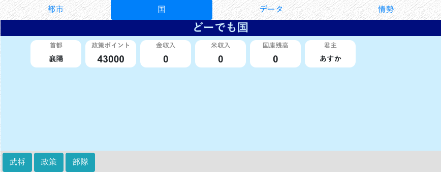 国の都市の数値一覧、武将の配置などを一括で表示します。