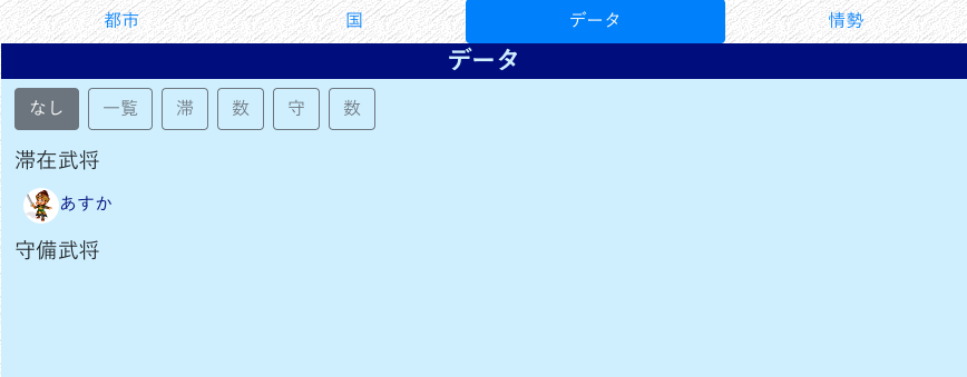 守備(当時) | 重宝された他国都市 | その都市に諜報時点で守備している武将一覧を表示します |