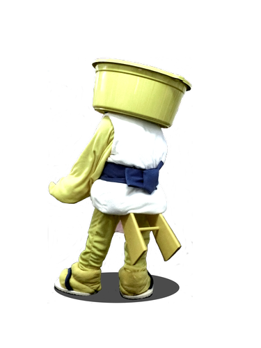 頭はフロ桶になっており、頭の黄色い風呂桶には、緑で『鹿児島・日置・東市来』、『天然温泉』、赤で『ユノモト』と印字されている。