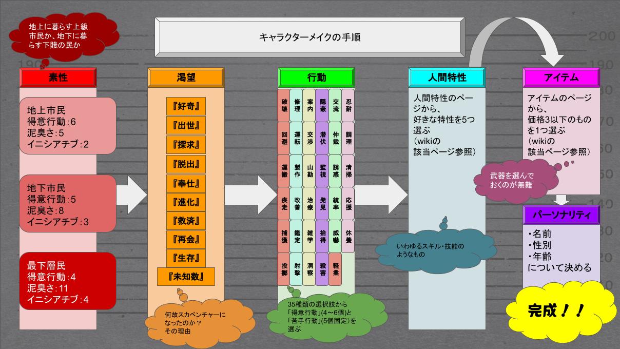 ここではプレイヤーが操作する廃墟世界(ポストアポカリプス)の雇われ冒険者、『スカベンチャー』を作成するための基本的な手順を扱います。