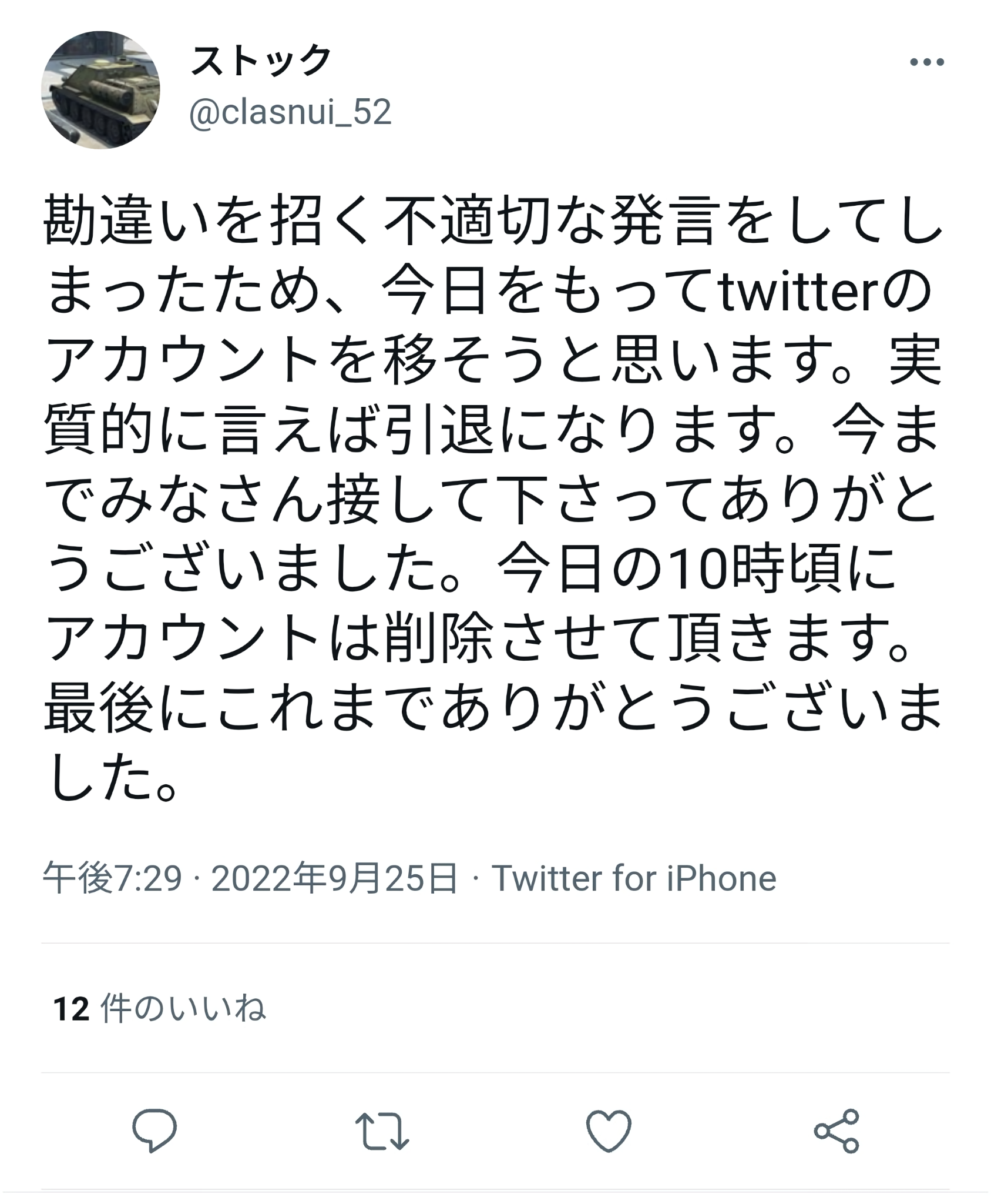 勘違いを招く不適切な発言をしてしまったため、今日をもってtwitterのアカウントを移そうと思います。実質的に言えば引退になります。今までみなさん接して下さってありがとうございました。今日の10時頃にアカウントは削除させて頂きます。最後にこれまでありがとうございました。