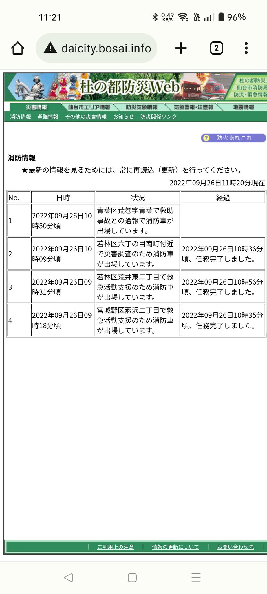 荒巻字青葉で救助事故発生でポンプ車2台、救急車2台、指揮車、人員輸送車(マイクロバス)、救助工作車が地獄坂登ってったぞ。