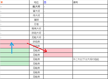 以下は偶数位を東、奇数位を西に分けました。東の軍大将の空白はこれによる偏りを防ぐためです。来月からは東にも軍大将が入ります。