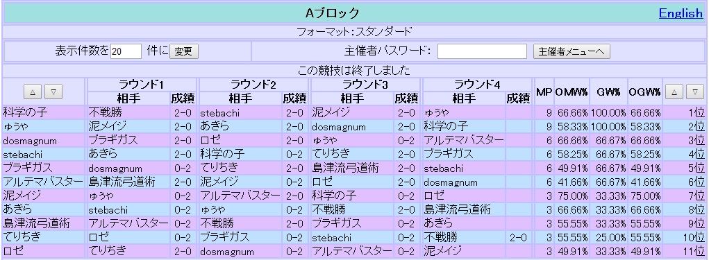 - 各ブロックに分かれてスイスドローによる予選を行い、各ブロック上位2名が決勝トーナメントに進出する