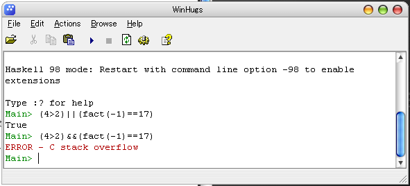 &&の場合は後ろの式の評価が必要となり、fact(-1)を実行して乙。