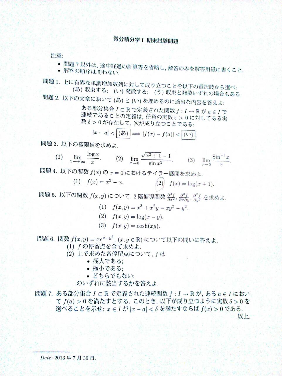 五味先生に期末試験について聞いたところによると、計算問題が主体で証明問題はやさしいものを出すかもしれない、とのことです。五味先生は去年から医学科の微積分を担当しており、難易度は去年と同じと言っていたので12Mの過去問をよく参考にしてください。ちなみに、12Mの過去問の解答は先生から直接いただきました。詳しいことは七月になったら教えてくれるそうなので、そのときになったらお知らせします。