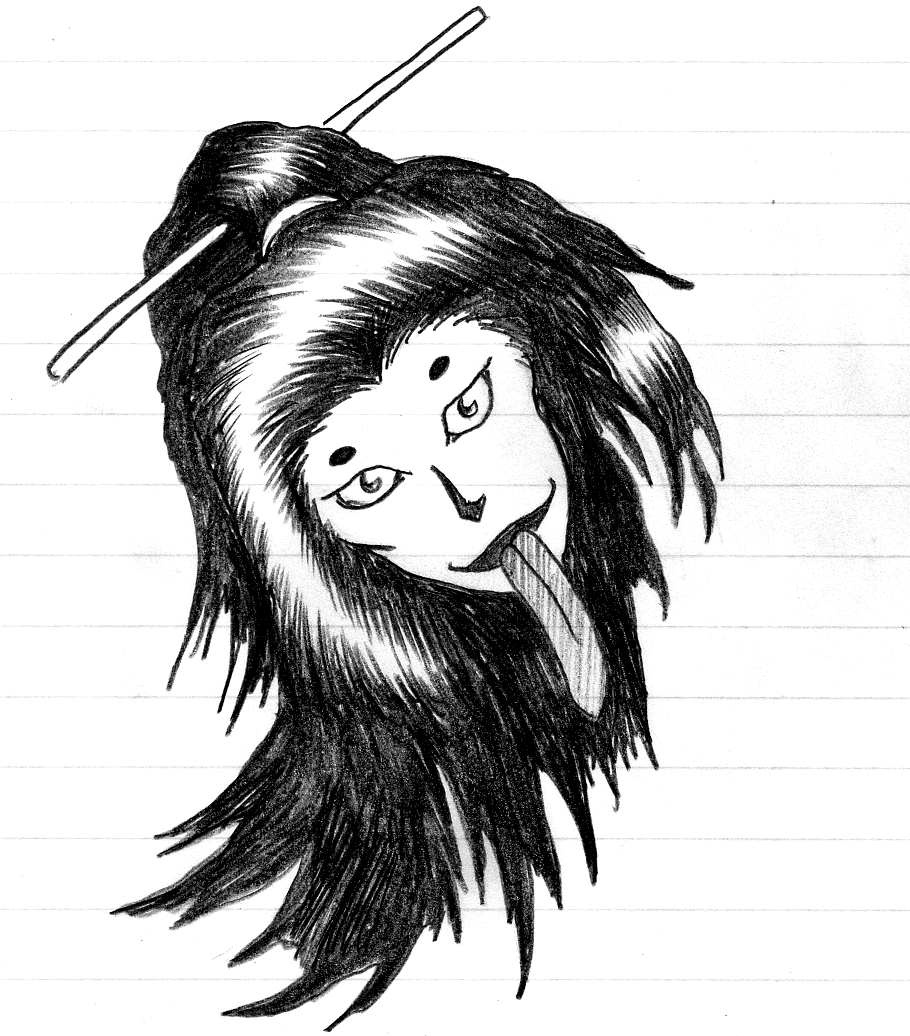 長い髪、細い女、太い鼻、黒々としたお歯黒の女の首で、大きさは一間(1.8m)以上はある。