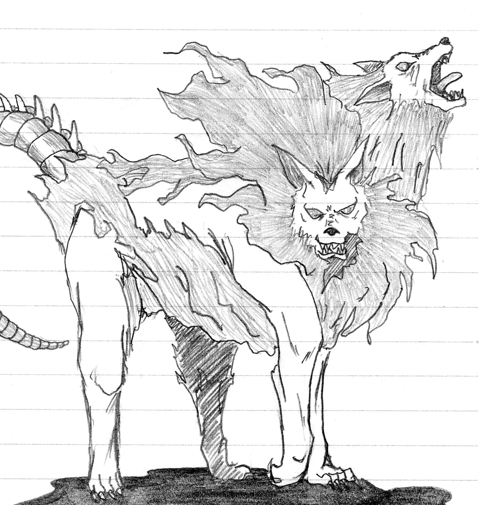 2つの頭の他に、背中から7つの蛇の頭が生え、尻尾も蛇になるといわれている。