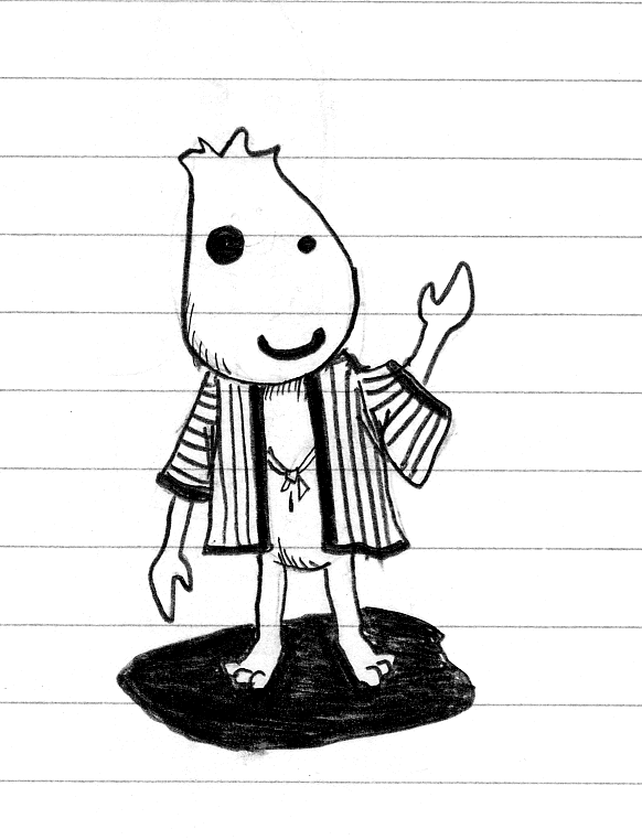 芥子坊主のような頭をして、青い着物を着ている、6~7歳の子供の姿をしている。