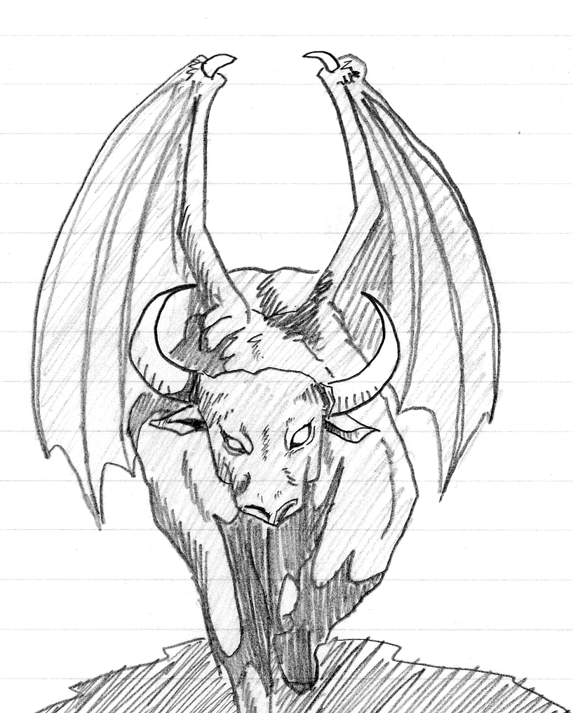 その姿は蛇の髪と身体を持っていると伝えられていたが、羽を持った雄牛の姿の怪物が同名で呼ばれるようになった。