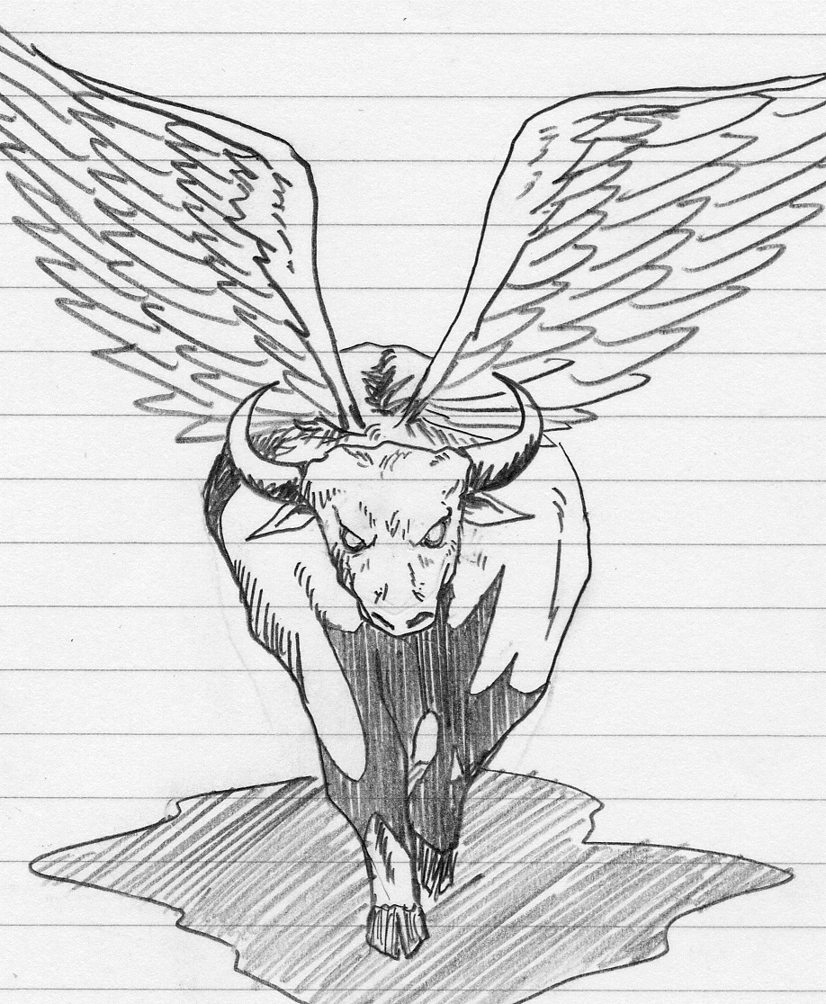 人間の姿を取る時もあるが、グリフォンの翼を持った牡牛の姿が一般的。この姿は、福音書の一人、聖ルカのシンボルである牛のパロディであると考えられる。