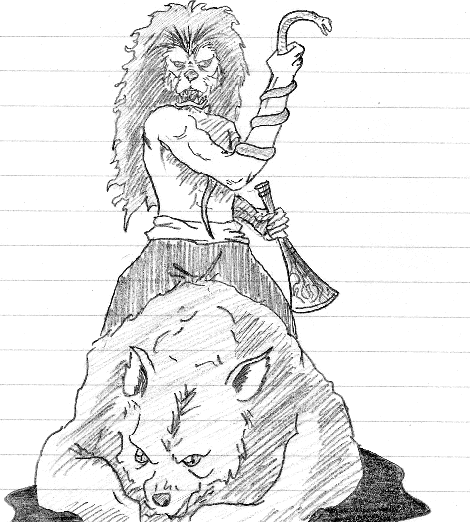 熊にまたがり、片手に蛇をからませた獅子頭の逞しい男で、ファンファーレと共に現れる。また、妖精の姿にも変身できる。